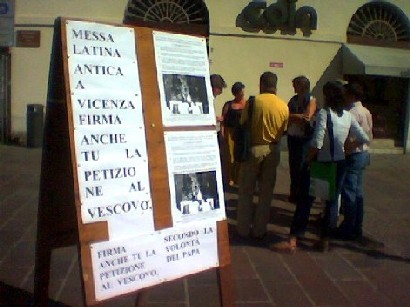 Già dalla scorsa estate si era formato in Vicenza un gruppo di soci di Una Voce, e vi era stata costituita una delegazione del Coordinamento di Una Voce delle Venezie. Il gruppo promuoveva una pubblica petizione di fedeli all'Ordinario diocesano per ottenere la celebrazione dell'antica messa. L'iniziativa veniva presentata all'opinione pubblica con una conferenza stampa tenuta a Vicenza il giorno 17 settembre. Nei mesi di settembre e ottobre, per più fine settimana, venivano raccolte le firme sulla pubblica piazza in numero totale di 673.