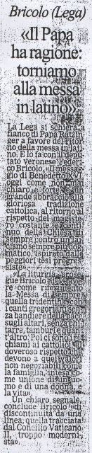 La Lega si schiera a fianco di Papa Ratzinger a favore del ritorno della messa in latino. E lo fa con il deputato veronese Federico Bricolo. "Il messaggio di Benedetto XVI, oggi come non mai chiaro e forte, è un grande abbraccio alla gloriosa tradizione cattolica, al ritorno al rispetto del magistero costante e continuo della Chiesa di sempre contro un laicismo sempre più dogmatico, ispirato dalle peggiori tesi progressiste".