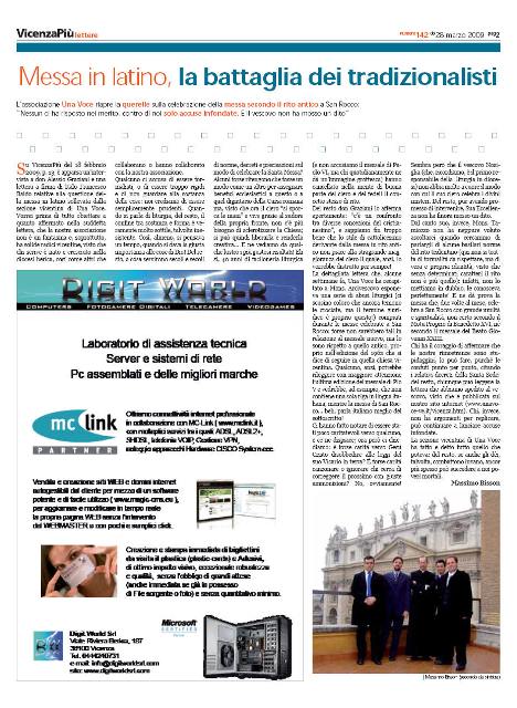 Su VicenzaPiù del 18 febbraio 2009, p. 13, è apparsa un'intervista a don Alessio Graziani e una lettera a firma di Italo Francesco Baldo relative alla questione della messa in latino sollevata dalla sezione vicentina di Una Voce. Vorrei prima di tutto obiettare a quanto affermato nella suddetta lettera, che la nostra associazione non è un fantasma e, soprattutto, ha solide radici vicentine, visto che chi scrive è nato e cresciuto nella diocesi berica, così come altri che collaborano o hanno collaborato con la nostra associazione.
