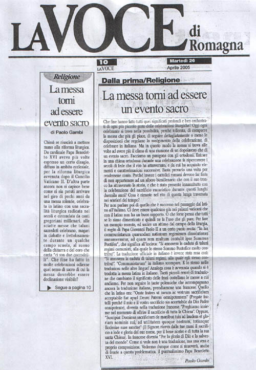 Per non parlare poi di quello che è successo nel passaggio dal latino all'italiano. Ci deve essere qualcuno giù nei palazzi vaticani che con il latino non ha un buon rapporto. O che forse pensa che tutti se lo siano dimenticato e quindi ne fa l'uso che gli pare. Per fare un esempio recente, ed uscire un attimo dal campo della liturgia, il rogito di Papa Giovanni Paolo II a un certo punto recita: "In his communistarum quarundam nationum regiminum dissolutiones annumerantur, ad quam rem multum contulit ipse Sumrnus Pontifex", che significa all'incirca: "Si annovera la caduta di taluni regimi comunisti, alla quale lo stesso Sommo Pontefice molto contribuì". La traduzione ufficiale in italiano è invece stata resa cosi: ''Si annovera la caduta di taluni regimi, alla quale egli stesso contribuì". "Communistarum" in italiano scompare. E lo stesso nelle traduzioni nelle altre lingue! Analoga cosa è avvenuta quando si è tradotta la messa latina in italiano. Tanti piccoli errori dì traduzione che cambiano il significato delle frasi costellano le messe a cui andiamo. Per non seguire le tante polemiche che accompagnano ancora la traduzione italiana, prendiamone una francese. Quello che in latino era: "Orate fratres ut meum ac vestrum sacrifìcìum acceptabiie fiat apud Deum Patrem omnipotentem" (Pregate fratelli perché il mio e il vostro sacrificio sia accettabile da Dio Padre onnipotente), diventa nella traduzione francese, "Preghiamo insieme nel momento di offrire il sacrificio di tutta la Chiesa". Oppure, "Suscipiat Dominus sacrificium de manibus tuis ad laudem et gloriam nominis sui, ad utilitatem quoque nostram, totiusque Ecciesiae suae sanctae" (Il Signore riceva dalle tue mani il sacrificio a lode e gloria del suo nome, per il bene nostro e di tutta la sua santa Chiesa), in francese diventa "Per la gloria dì Dio e la salvezza del mondo". Come si vede non e una traduzione, ma una vera e propria composizione. Vedremo dunque come si muoverà, anche di fronte a questa problematica, il puntualissimo Papa Benedetto.