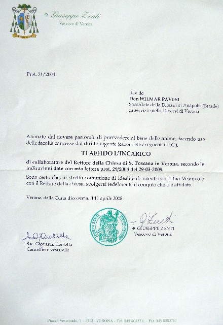 Il rev.do Vilmar Pavesi, sacerdote italo-brasiliano della diocesi di Anápolis, cittadino italiano, che celebra la messa secondo l'antico rito, dopo alterne vicende č stato accolto nella diocesi di Verona. Il decreto del vescovo mons. Giuseppe Zenti di data 11 aprile 2008, Prot. 34/2008 gli affida "l'incarico di collaboratore del Rettore della Chiesa di S. Toscana in Verona", secondo le indicazioni date con separata lettera del 29 marzo.