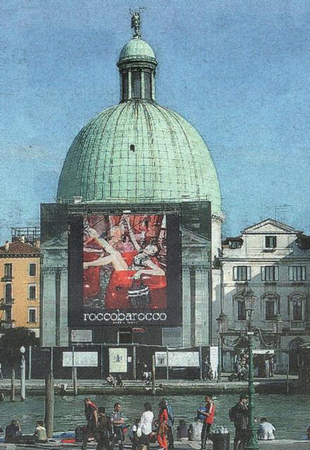 Alcuni giorni orsono č stato rimosso dalla facciata della chiesa di S. Simon Piccolo a Venezia il cartellone pubblicitario che aveva suscitato scandalo e proteste, e anche l'intervento della Curia patriarcale, su cui si erano diffusi i mezzi di informazione all'inizio di maggio Come si puņ vedere nell'immagine di sinistra, lo spazio pubblicitario č al momento vuoto.