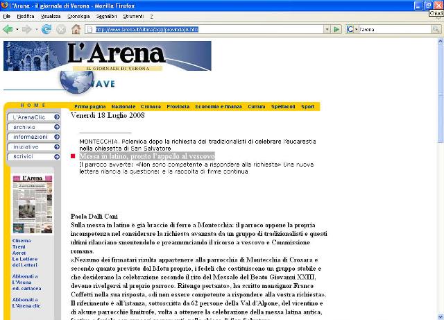 L'Arena del 18 luglio 2008 riferisce ampiamente di una richiesta di applicazione del Motu proprio Summorum Pontificum nella parrocchia di Montecchìa di Crosara, provincia di Verona ma diocesi di Vicenza. Lasciano senza dubbio attoniti la raffica di dichiarazioni del parroco mons. Franco Coffetti, il quale - pur di lavarsi le mani della richiesta della messa tridentina - sembra oscillare tra dichiararsi "incompetente" e proporre addirittura la costituzione di una "parrocchia personale". Che farà ora il vescovo di Vicenza mons. Nosiglia, se non è ancora partito per le spiagge, noto nemico della messa (cfr. www.unavoce-ve.it/05-05-50.htm )?