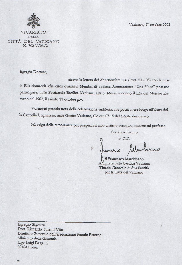 ricevo la lettera del 29 settembre u.s. (Prot. 21 - 03) con la quale Ella domanda che circa quaranta Membri di codesta Associazione "Una Voce" possano partecipare, nella Patriarcale Basilica Vaticana, alla S. Messa secondo il rito del Messale Romano del 1962, il sabato 11 ottobre p.v.