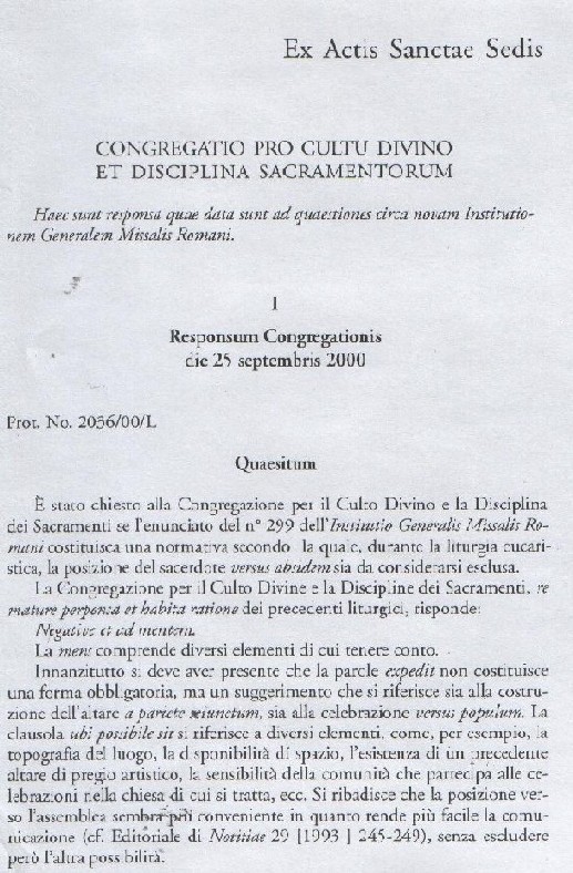 È stato chiesto alla Congregazione per il Culto Divino e la Disciplina dei Sacramenti se l'enunciato del n° 299 dell'Institutio Generalis Missalis Romani costituisca una normativa secondo la quale, durante la liturgia eucaristica, la posizione del sacerdote versus absidem sia da considerarsi esclusa.