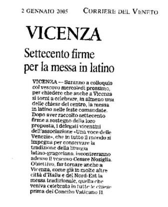 VICENZA - Saranno a colloquio col vescovo mercoledì prossimo, per chiedere che anche a Vicenza si torni a celebrare, in almeno una chiesa del centro, la messa in latino nelle feste comandate. Dopo aver raccolto settecento firme a sostegno della loro proposta, i delegati vicentini dell'associazione "Una Voce delle Venezie", che in tutto il mondo si impegna per conservare la tradizione della liturgia latino-gregoriana, incontreranno adesso il vescovo Cesare Nosiglia. Obiettivo, far tornare anche a Vicenza, come già in molte altre città d'Italia e del Nord-Est, la messa tradizionale, quella che veniva celebrata in tutte le chiese prima del Concilio Vaticano II.