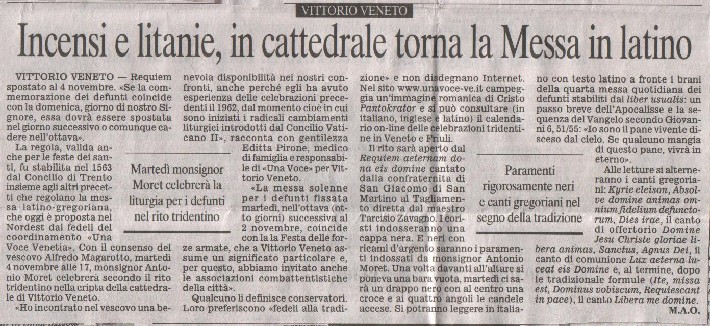 La regola, valida anche per le feste dei santi, fu stabilita nel 1563 dal Concilio di Trento insieme agli altri precetti che regolano la messa latino-gregoriana, che oggi è proposta nel Nordest dai fedeli del coordinamento "Una Voce Venetia". Con il consenso del vescovo Alfredo Magarotto, martedì 4 novembre alle 17, monsignor Antonio Moret celebrerà secondo il rito tridentino nella cripta della cattedrale di Vittorio Veneto.