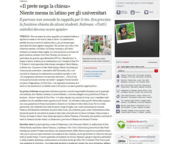 La prima richiesta era già stata inoltrata al parroco, nonché responsabile diocesano per la pastorale universitaria, don Mariano Ambrosi, lo scorso febbraio. "Avevamo allegato una quindicina di firme di studenti - dicono i membri di Una Voce - ci è stato risposto che, sentita la Curia, non ci sarebbero stati problemi ma che sarebbero state opportune più firme". La richiesta è stata quindi riformulata a giugno con una quarantina di firme tra studenti e docenti e il via libera di fatto della Curia. Poi il no della parrocchia: don Ambrosi, fuori città durante il mese di luglio, non vuole commentare la vicenda. Nessuna dichiarazione nemmeno da parte della Curia, che conferma, però, come l'orientamento della diocesi sia quello di concedere la messa in latino alle comunità che ne fanno richiesta. Come accade a Verona (la messa in latino viene detta ogni giorno a Santa Toscana, a Veronetta, solo qualche centinaio di metri di distanza da San Paolo) e a Desenzano, provincia di Brescia ma diocesi di Verona.