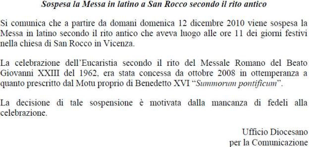 Si comunica che a partire da domani domenica 12 dicembre 2010 viene sospesa la Messa in latino secondo il rito antico che aveva luogo alle ore 11 dei giorni festivi nella chiesa di San Rocco in Vicenza.
