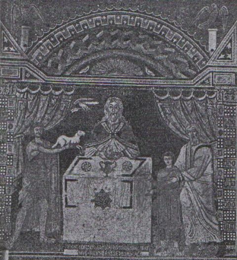 Il sacrificio di Melchisedech con ai lati rappresentati simbolicamente quelli di Abele e di Abramo. Musaico