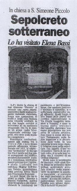 La prof. Bassi, che ha visitato la cripta - assieme a Sandra Varaschin, autrice delle fotografie e dei rilievi - sfidando le condizioni del pavimento e dell'illuminazione, che rendono insicuro e stentato il cammino, si è soffermata soprattutto sugli affreschi. Quelli lungo il lato basso delle pareti dei corridoi rappresentano la Via Crucis (soggetto rarissimo a Venezia) e sono in buona parte lesionati dall'umidità: disvelano una mano popolaresca ma non priva di cultura artistica, così come le scene dell'Antico Testamento sulla fascia superiore e le decorazioni sulle volte. In una cappella invece sono dipinti religiosi stesi nella sepoltura con oggetti d'uso ecclesiastico, opera di un pittore colto, di scuola non veneta: era il cimitero di un Ordine religioso?