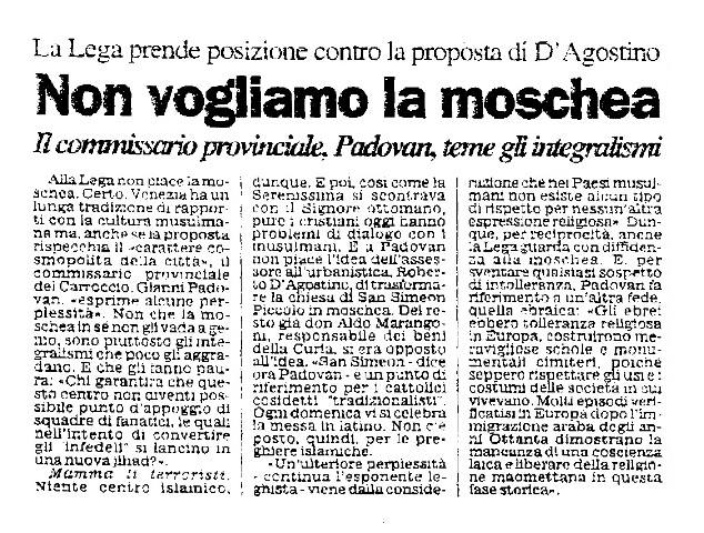 Alla Lega non piace la moschea. Certo Venezia ha una lunga tradizione di rapporti con la cultura musulmana ma, anche se la proposta rispecchia il "carattere cosmopolita della città", il commissario provinciale del Carroccio, Gianni Padovan, "esprime alcune perplessità". Non che la moschea in sé non gli vada a genio, sono piuttosto gli integralismi che poco gli aggradano. E che gli fanno paura: "Chi garantirà che questo centro non diventi possibile punto d'appoggio di squadre di fanatici, le quali nell'intento di convertire gli 'infedeli' si lancino in una nuova jihad?".