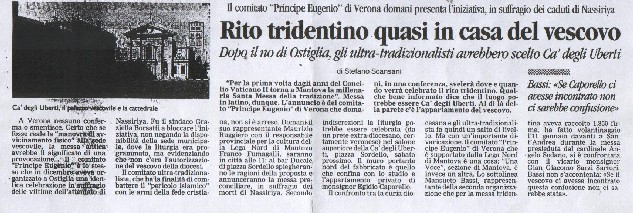A Verona nessuno conferma o smentisce. Certo che se fosse reale la "manovra di avvicinamento fisico" alla sede vescovile la messa antica avrebbe il significato di una provocazione. Il comitato "Principe Eugenio" č lo stesso che a dicembre aveva organizzato a Ostiglia una identica celebrazione in suffragio delle vittime dell'attentato di Nassiriya. Fu il sindaco Graziella Borsatti a bloccare l'iniziativa, non negando la disponibilitā della sede municipale, dove la liturgia era programmata, ma evidenziando che non c'era l'autorizzazione del vescovo della diocesi.
