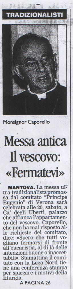 MANTOVA. La messa ultra-tradizionalista promossa dal comitato "Principe Eugenio" di Verona sarà celebrata alle 20, sabato, a Ca' degli Uberti, palazzo che affianca l'appartamento del vescovo. Caporello, che non ha mai risposto alle richieste del comitato, dice: "Spero che tutti vogliano fermarsi di fronte all'eucaristia, al di là delle intenzioni buone o inaccettabili". Stamattina il comitato con la Lega Nord tiene una conferenza stampa per spiegare i motivi della liturgia.