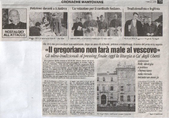 Fede, teologia e politica s'intrecciano in una vicenda iniziata nel gennaio del 2003 con 36 firme a sostegno del messale romano di San Pio V, riformato dal Concilio Vaticano II. A raccoglierle è il libraio antiquario Mansueto Bassi, rappresentante dell'associazione internazionale "Una Voce a salvaguardia della liturgia latino-gregoriana", che chiede al vescovo di essere ricevuto in udienza per esporre le proprie ragioni. Inascoltato, Bassi torna alla carica in maggio con una raccolta di firme a cui aderiscono 1.350 persone. In dicembre all'iniziativa del libraio antiquario si aggiunge quella di un gruppo di esponenti della Lega Nord di Ostiglia che decide di dedicare una messa antica ai caduti dì Nassirya, rivolgendosi ai tradizionalisti del comitato. Tutto sembra pronto per la celebrazione: il sindaco di Ostiglia Graziella Borsatti concede l'uso della sede municipale ma all'ultimo momento, in assenza dell'autorizzazione del vescovo, la messa salta. Gli ultra-tradizionalisti recalcitrano, non ritengono l'autorizzazione  necessaria ma accettano dì presentare formale richiesta al vescovo, da cui attendono ancora una risposta. Il cerchio attorno a monsignor Caporello si chiude in gennaio: approfittando della presenza del cardinale Sodano, che celebra in Sant'Andrea la messa per l'ordinazione di monsignor Pecorari, Bassi organizza un volantinaggio mentre il comitato "Principe Eugenio" rilancia e annuncia la messa di Ca' degli Uberti. Dal vescovo - prima della nota che ieri ha inviato alla "Gazzetta" - solo una dichiarazione, che ha il sapore di un appello: "Spero che tutti vogliano fermarsi di fronte all'eucaristia, al di là delle intenzioni buone o inaccettabili",