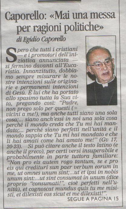 Spero che tutti i cristiani - e i promotori dell'iniziativa annunciata - si fermino davanti all'Eucaristia. Innanzitutto, dobbiamo sempre misurare le nostre intenzioni sulle originarie e permanenti intenzioni di Gesù. È lui che ha portato allo spasimo tutta la Sua vita, pregando cosi: "Padre, non prego solo per questi (= vicini a me!), ma anche tutti siano una sola cosa; ... siano anch'essi in noi una sola cosa perché il mondo creda che Tu mi hai mandato; ... perché siano perfetti nell'unità e il mondo sappia che Tu mi hai mandato e che li hai amati come hai amato me!" (Gv 17,20-23). Si può citare anche il testo latino (e anche il greco), per certi versi insuperabile e probabilmente in parte tuttora familiare: "Non pro eis autem rogo tantum, se et pro eis qui credituri sunt per verbum eorum in me, ut omnes unum sint: ... ut et ipsi in nobis unum sint: ... ut sint consummati in unum (dice proprio "consumati!", cioè perfetti nell'unità), et cognoscat mundus quia tu me misisti, et dilexisti eos sicut et me dilexisti!".