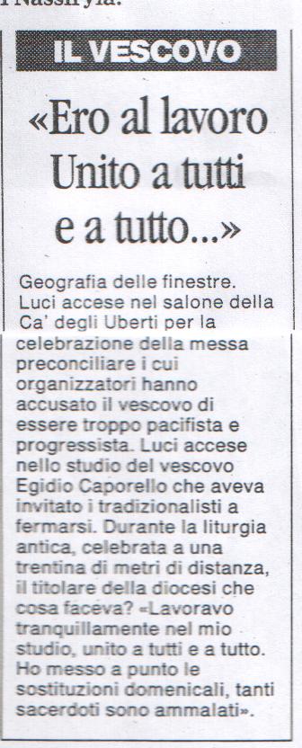 Geografia delle finestre. Luci accese nel salone della Ca' degli Uberti per la celebrazione della messa preconciliare i cui organizzatori hanno accusato il vescovo di essere troppo pacifista e progressista. Luci accese nello studio del vescovo Egidio Caporello che aveva invitato i tradizionalisti a fermarsi. Durante la liturgia antica, celebrata a una trentina di metri di distanza, il titolare della diocesi che cosa faceva? "Lavoravo tranquillamente nel mio studio, unito a tutti e a tutto. Ho messo a punto le sostituzioni domenicali, tanti sacerdoti sono ammalati".