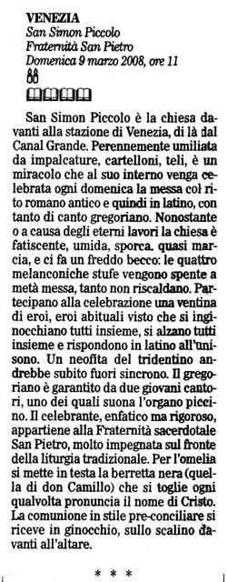 San Simon Piccolo è la chiesa davanti alla stazione di Venezia, di là dal Canal Grande. Perennemente umiliata da impalcature, cartelloni, teli, è un miracolo che al suo interno venga celebrata ogni domenica la messa col rito romano antico e quindi in latino, con tanto di canto gregoriano. Nonostante o a causa degli eterni lavori la chiesa è fatiscente, umida, sporca, quasi marcia, e ci fa un freddo becco: le quattro melanconiche stufe vengono spente a metà messa, tanto non riscaldano. Partecipano alla celebrazione una ventina di eroi, eroi abituali visto che si inginocchiano tutti insieme, si alzano tutti insieme e rispondono in latino all'unisono Un neofita del tridentino andrebbe subito fuori sincrono. Il gregoriano è garantito da due giovani cantori, uno dei quali suona l'organo piccino. Il celebrante. enfatico ma rigoroso, appartiene alla Fraternità sacerdotale San Pietro. molto impegnata sul fronte della liturgia tradizionale Per l'omelia si mette in testa la berretta nera (quella di don Camillo) che si toglie ogni qualvolta pronuncia il nome di Cristo. La comunione in stile pre-conciliare si riceve m ginocchio, sullo scalino davanti all’altare.