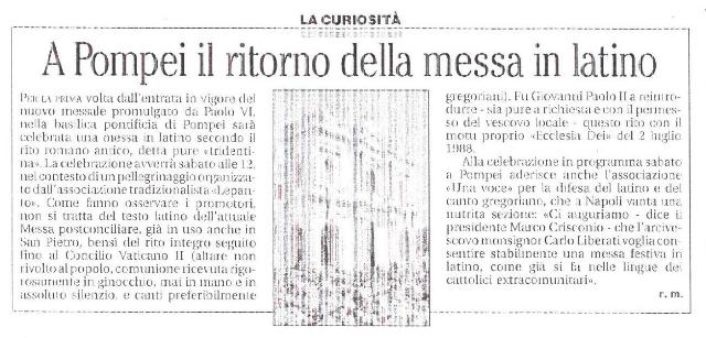 Per la prima volta dall'entrata in vigore del nuovo messale promulgato da Paolo VI, nella basilica pontificia di Pompei sarà celebrata, una messa in latino secondo il rito romano antico, detta pure "tridentina". La celebrazione avverrà sabato alle 12, nel contesto di un pellegrinaggio organizzato dall'associazione tradizionalista "Lepanto". Come fanno osservare i promotori, non si tratta del testo latino dell'attuale Messa postconciliare, già in uso anche in San Pietro, bensì del rito integro seguito fino al Concilio Vaticano II (altare non rivolto al popolo, comunione ricevuta rigorosamente in ginocchio, mai in mano e in assoluto silenzio, e canti preferibilmente gregoriani). Fu Giovanni Paolo II a reintrodurre - sia pure a richiesta e con il permesso del vescovo locale - questo rito con il motu proprio "Ecclesia Dei" del 2 luglio 1988.