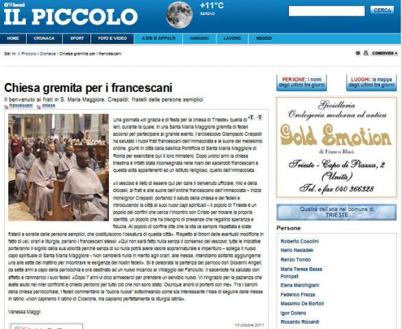 Una giornata "di grazia e di festa per la chiesa di Trieste" quella di ieri, durante la quale, in una Santa Maria Maggiore gremita di fedeli accorsi per partecipare al grande evento, l'arcivescovo Giampaolo Crepaldi ha salutato i nuovi frati francescani dell'Immacolata e le suore del medesimo ordine, giunti in città dalla basilica Pontificia di Santa Maria Maggiore di Roma per esercitare qui il loro ministero. Dopo undici anni la chiesa triestina è infatti stata riconsegnata nelle mani dei sacerdoti francescani e questa volta appartenenti ad un istituto religioso, quello dell'Immacolata.