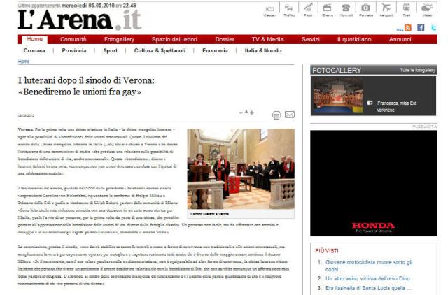 Verona. Per la prima volta una chiesa cristiana in Italia - la chiesa evangelica luterana - apre alla possibilità di "benedizione" delle unioni omosessuali. Questo il risultato del sinodo della Chiesa evangelica luterana in Italia (Celi) che si è chiuso a Verona e ha deciso l’istituzione di una commissione di studio "che produca una relazione sulla possibilità di benedizione delle unioni di vita, anche omosessuali". Questa "benedizione", dicono i luterani italiani in una nota, "comunque non può e non deve essere confusa con l’ipotesi di una celebrazione nuziale".