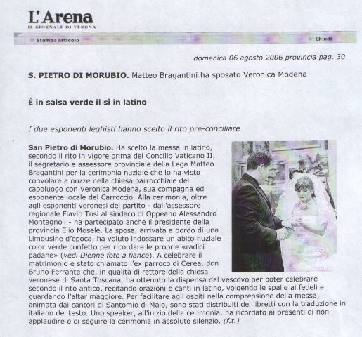 San Pietro di Morubio. Ha scelto la messa in latino, secondo il rito in vigore prima del Concilio Vaticano II, il segretario e assessore provinciale della Lega Matteo Bragantini per la cerimonia nuziale che lo ha visto convolare a nozze nella chiesa parrocchiale del capoluogo con Veronica Modena, sua compagna ed esponente locale del Carroccio. Alla cerimonia, oltre agli esponenti veronesi del partito - dall'assessore regionale Flavio Tosi al sindaco di Oppeano Alessandro Montagnoli - ha partecipato anche il presidente della provincia Elio Mosele. La sposa, arrivata a bordo di una Limousine d'epoca, ha voluto indossare un abito nuziale color verde confetto per ricordare le proprie "radici padane" (vedi Dienne foto a fianco). A celebrare il matrimonio è stato chiamato l'ex parroco di Cerea, don Bruno Ferrante che, in qualità di rettore della chiesa veronese di Santa Toscana, ha ottenuto la dispensa dal vescovo per poter celebrare secondo il rito antico, recitando orazioni e canti in latino, volgendo le spalle ai fedeli e guardando l'altar maggiore. Per facilitare agli ospiti nella comprensione della messa, animata dai cantori di Santomio di Malo, sono stati distribuiti dei libretti con la traduzione in italiano del testo. Uno speaker, all'inizio della cerimonia, ha ricordato ai presenti di non applaudire e di seguire la cerimonia in assoluto silenzio. (f.t.)