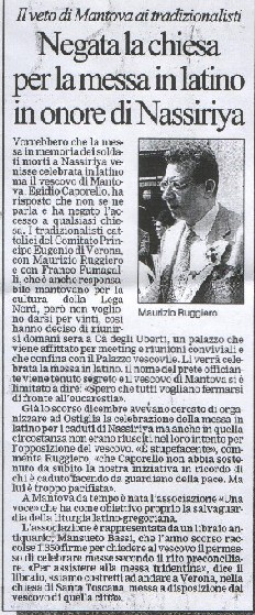 Vorrebbero che la messa in memoria dei soldati morti a Nassiriya venisse celebrata in latino ma il vescovo di Mantova, Egidio Caporello, ha risposto che non se ne parla e ha negato l'accesso a qualsiasi chiesa. I tradizionalisti cattolici del Comitato Principe Eugenio di Verona, con Maurizio Ruggiero e con Franco Fumagalli, che è anche responsabile mantovano per la cultura della Lega Nord, però non vogliono darsi per vinti, così hanno deciso di riunirsi domani sera a Cà degli Uberti, un palazzo che viene affittato per meeting e riunioni conviviali e che confina con il Palazzo vescovile. Lì verrà celebrata la messa in latino, il nome del prete officiante viene tenuto segreto e il vescovo di Mantova si è limitato a dire: "Spero che tutti vogliano fermarsi di fronte all'eucarestia".