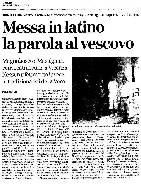L'articolo dell'Arena del 13 agosto 2008 riferisce che l'arcivescovo Nosiglia riceverà il 4 settembre i richiedenti la messa tridentina a Montecchia di Crosara. Si deve rilevare che il riferimento "alle 700 firme con cui, nel 2004, altrettanti vicentini chiesero, senza risposta, la celebrazione della messa di San Pio V" - in chiusa del pezzo - contiene una grave inesattezza, tale da deformare la correttezza dell'informazione. Infatti non è vero quanto afferma l'articolista che la richiesta di circa 700 fedeli della diocesi nel 2004 fu "senza risposta". La risposta di mons. Nosiglia ci fu e fu negativa: essa è contenuta in una lettera non protocollata di data 1° marzo 2005 indirizzata al delegato di Vicenza di Una Voce delle Venezie. Come veniva dimostrato in un comunicato diramato da Una Voce Vicenza nel corso di una conferenza stampa il successivo 30 marzo, le motivazioni apportate in questa lettera non sono adeguate a giustificare il diniego a un desiderio legittimo - riconosciuto come tale dallo stesso Arcivescovo - e fondato su precise disposizioni della Santa Sede.
