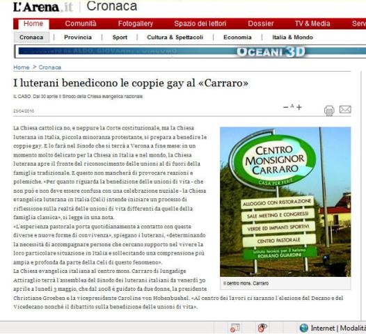 Il vescovo di Verona mons. Zenti da anni conferma la concessione della chiesa di S. Pietro Martire ai luterani, fatta dal suo predecessore mons. Carraro, con forti pubbliche proteste di fedeli cattolici. Ora con la benedizione delle coppie omosessuali, ipocritamente denominate "unioni di vita", proprio nell'attuale momento, i luterani, proprio a Verona, compiono un gesto di aperta ostilità e avversione contro la Chiesa cattolica e il Santo Padre. Che cosa fa il vescovo di Verona? In questi giorni si parla tanto degli attacchi al Papa per la questione dei preti pedofili, ed è riconosciuto il danno derivante dall'inerzia dell'autorità ecclesiastica nell'intervenire su casi esistenti e denunciati. Naturalmente i danni di una tale inerzia non ci sono soltanto nel caso della pedofilia, l'inerzia denota il più delle volte un cattivo esercizio dell'autorità. Davanti al problema evidente e conclamato dei luterani a S. Pietro Martire, mons. Zenti continua ad attendere. Che si risolva da sé? non si risolve, ma diventa sempre peggio. Molti possono pensare che a questo punto, se il vescovo non risolve il problema, significa o che vuole che i luterani restino là (forse perché è d'accordo anche lui sulle "unioni di vita"?), oppure che non è in grado di governare la sua diocesi. Certamente i fatti daranno una risposta.