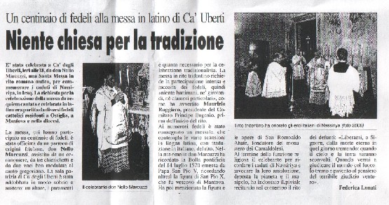 È stata celebrata a Ca' degli Uberti, ieri alle 18, da don Nello Marcuzzi, una Santa Messa in rito romano antico, per commemorare i caduti di Nassiriya, in Iraq. La richiesta per la celebrazione della messa da requiem cantata e celebrata in latino era partita da diversi fedeli cattolici residenti a Ostiglia, a Mantova e nella diocesi.