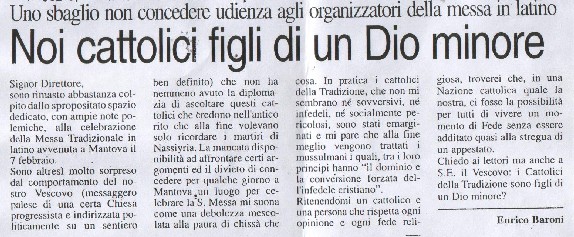 Sono altresì molto sorpreso dal comportamento del nostro Vescovo (messaggero palese di una certa Chiesa progressista e indirizzata politicamente su un sentiero ben definito) che non ha nemmeno avuto la diplomazia di ascoltare questi cattolici che credono nell'antico rito che alla fine volevano solo ricordare i martiri di Nassiyria. La mancata disponibilità ad affrontare certi argomenti ed il divieto dì concedere per quel giorno a Mantova un luogo per celebrare la S. Messa mi suonano come una debolezza mescolata alla paura di chissà che cosa. In pratica i cattolici della Tradizione, che non mi sembrano né sovversivi né infedeli né socialmente pericolosi, sono stati emarginati e mi pare che alla fine meglio vengono trattati i musulmani, i quali, tra i loro principî hanno "il dominio e la conversione forzata dell'infedele cristiano".