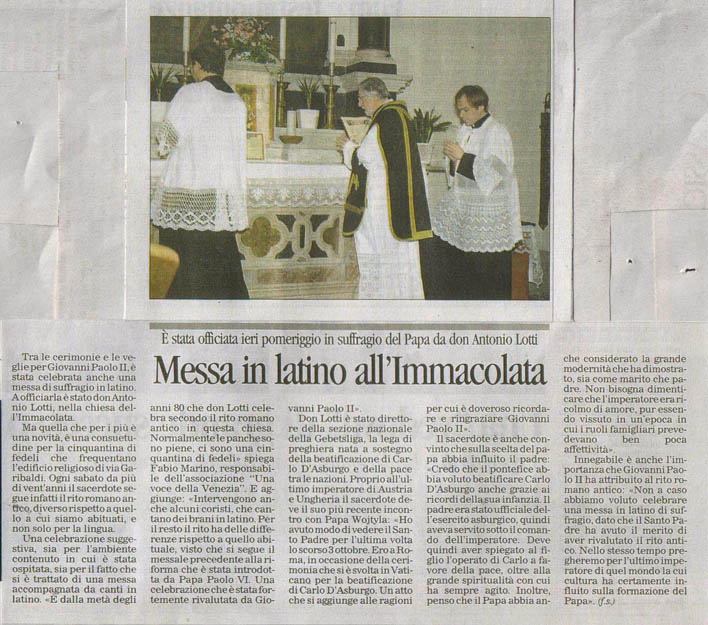 Innegabile è anche l'importanza che Giovanni Paolo II ha attribuito al rito romano antico: "Non a caso abbiamo voluto celebrare una messa in latino di suffragio, dato che il Santo Padre ha avuto il merito di aver rivalutato il rito antico. Nello stesso tempo pregheremo per l'ultimo imperatore di quel mondo la cui cultura ha certamente influito sulla formazione del Papa". (f.s.)
