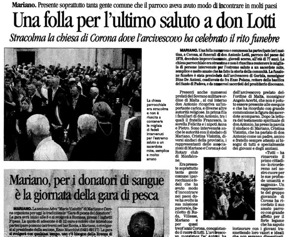 MARIANO. Una folla numerosa e commossa ha partecipato ieri mattina, a Corona, al funerali di don Antonio Lotti, parroco del paese dal 1979, deceduto improvvisamente, giovedì scorso, all'età dl 77 anni. La chiesa parrocchiale era stracolma e non è riuscita a contenere le migliaia di persone intervenute per l'estremo saluto a un sacerdote mite, semplice e molto amato che fatto la storia della comunità. La funzione funebre è stata presieduta dall'arcivescovo di Gorizia, monsignor Dino De Antoni, coadiuvato da fra Enzo Poiana, rettore della basilica del Santo di Padova, e da numerosi sacerdoti del presbiterio diocesano.
