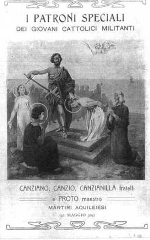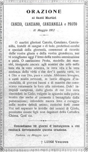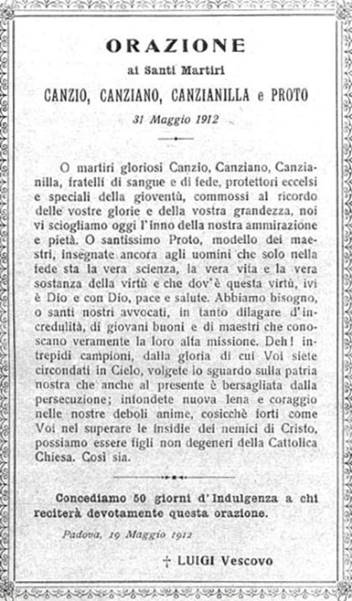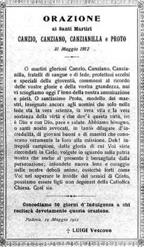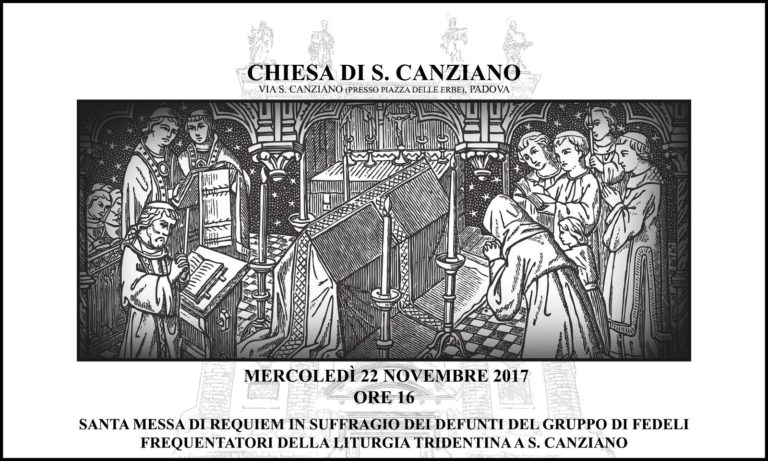 cantata il 24 maggio 2015 Domenica di Pentecoste 2014 Padova, chiesa di S. Canziano vulgo S. Rita, messa cantata in rito tridentino il 1° novembre 2014 Padova, chiesa di S. Canziano vulgo S. Rita, messa cantata in rito tridentino il 22 giugno 2014 Padova, chiesa cappella universitaria di S. Caterina, vespri solenni il 31 maggio 2014 (immagini) Padova, scoletta del Santo, messa cantata il 15 febbraio 2014 Padova, chiesa dei Servi, messa cantata il 14 febbraio 2014 2013 Padova, chiesa di S. Caterina, messa tridentina il 25 novembre 2013 Padova, parrocchia di Gesù Buon Pastore, messa tridentina il 16 novembre 2013 Pra d’Este, chiesa della Ss. Trinità, messa di requiem il 2 novembre 2013 Padova, chiesa di S. Canziano vulgo S. Rita, messa dei Morti il 2 novembre 2013 Padova, oratorio della Salute messa cantata in rito tridentino il 14 settembre 2013 Ospedaletto Euganeo Pd, santuario della Madonna del Tresto, messa tridentina il 30 giugno 2013 2012 Padova, chiesa di S. Canziano vulgo S. Rita, messa dei Morti il 2 novembre 2012 Padova, chiesa di S. Canziano vulgo S. Rita, messa cantata in rito tridentino il 28 ottobre 2012 Padova, chiesa di S. Canziano vulgo S. Rita, messa cantata il 3 giugno 2012 Padova, chiesa di S. Canziano vulgo S. Rita, messa cantata il 27 maggio 2012 Padova, chiesa di S. Canziano vulgo S. Rita, messa cantata il 20 maggio 2012 Padova, chiesa di S. Canziano vulgo S. Rita, messa cantata il 26 febbraio 2012 Padova, chiesa di S. Canziano vulgo S. Rita, messa di riparazione il 29 gennaio 2012 2011 Padova, chiesa di S. Canziano vulgo S. Rita, messa cantata l’8 dicembre 2011 Padova, chiesa di S. Canziano vulgo S. Rita, messa cantata il 30 ottobre 2011 Padova, chiesa di S. Canziano vulgo S. Rita, messa dei Morti il 2 novembre 2011 Padova. Messa tridentina alla chiesa di S. Gaetano Padova, chiesa di S. Canziano vulgo S. Rita, messa cantata il 2 ottobre 2011 Sambruson di Dolo, 11 settembre 2011. Nozze e messa in rito tridentino Sambruson di Dolo (Venezia), chiesa arcipretale di S. Ambrogio, messa tridentina l’11 settembre 2011 Padova, chiesa di S. Canziano vulgo S. Rita, messa il 29 maggio 2011 2010 Padova, chiesa di S. Canziano vulgo S. Rita, messa dei Morti il 2 novembre 2010 Padova, alla Basilica del Santo ritorna la messa tridentina Padova, basilica del Santo Cappella del Ss.mo Sacramento messa cantata il 19 giugno 2010 (foto) A Sambruson di Dolo il 14 febbraio 2010. Messa in rito romano antico per la festa di san Valentino 2006 Nuovo altare a San Canziano. A rischio il Natale in latino (Corriere del Veneto, 16 dicembre 2006) 2004 Padova, finalmente la messa cantata a S. Canziano 2003 2001 A messa, ma in latino (Il Mattino di Padova, 28 marzo 2001) Crisi delle vocazioni e crisi della messa (Instaurare 1-2/2001) S. Canziano. I Santi titolari Quasi dieci secoli sono passati da quando un modesto gruppo di fedeli chiedeva al Vescovo l’autorizzazione ad erigere un “oratorium”, dedicandolo ai martiri di Aquileia. Quella Domus Dei, quella chiesa, ove Cristo Gesù scendeva ad accendere una fiammata d’amore tra le anime e il loro Redentore, non si è mai chiusa, né mai si è spento quel fuoco, né si è interrotto quel dialogo tra Cielo e terra. Generazioni e generazioni si sono prostate nella preghiera: altre verranno in questo tempietto, fatto più bello dall’arte e dallo zelo. Tra le vicende umane, nei dolori e nelle ansie, trovino qui i credenti l’onnipotente e misericordioso amore di Dio (mons. A. Barzon, numero unico pubblicato in occasione dei restauri del 1955) Santa Rita Conoscere la chiesa di S. Canziano 1. I santi titolari La chiesa è dedicata ai santi fratelli Canziano, Canzio, Canzianilla e a Proto, martiri di Aquileia (31 maggio 304). I tre fratelli e il loro maestro Proto, secondo quanto racconta Venanzio Fortunato, appartenevano alla antica e nobile gente degli Anicii, stabilitasi ad Aquileia. Scoperti e condannati come cristiani durante la persecuzione di Massimiano, avevano subito il martirio ad Aquas Gradatas (Grado). È forse per la dipendenza delle Chiese delle Venezie alla Chiesa aquileiense che il culto in onore dei martiri trova diffusione anche a Padova. Sul fregio del portale si legge: D.O.M. SANCTISQ. CANTIANO ET SOCIIS MARTYR. PIORUM OPE IN SPLENDIDIOREM / FACIEM CULTUMQUE RESTITUTUM M.D.C.XVII. (A Dio Ottimo Massimo, ai santi Canziano e compagni martiri, grazie alle offerte dei fedeli ricostruito con più sontuosa forma e ornamento 1617) 2. La chiesa nella storia della città La data 1617 indica la conclusione dei lavori di ricostruzione ed ampliamento della chiesa primitiva, una delle più antiche della città, citata in un atto notarile del 1034 e gravemente danneggiata dal disastroso terremoto del 1117 e dal terribile incendio del 1174. Questi lavori, iniziati presumibilmente qualche decennio prima, comportarono anche un cambiamento di asse, trasferendo la zona presbiteriale da est a sud, ma lasciando inalterato il campaniletto romanico che ancora oggi spunta tra i tetti delle case vicine. Il restauro del 1955 ha messo in luce, sul fianco destro della attuale costruzione, parte della vecchia facciata con il rosone ed alcune finestrelle, di un periodo che si ritiene successivo al 1117. La chiesa, benché piccola, forse per la sua posizione centrale, fu luogo di solenni cerimonie, come quella del 9 giugno 1180, durante la quale venne firmata la pace tra i Signori da Camino e gli abitanti di Conegliano. 3. L’architettura La facciata riprende il motivo dell’arco di trionfo romano