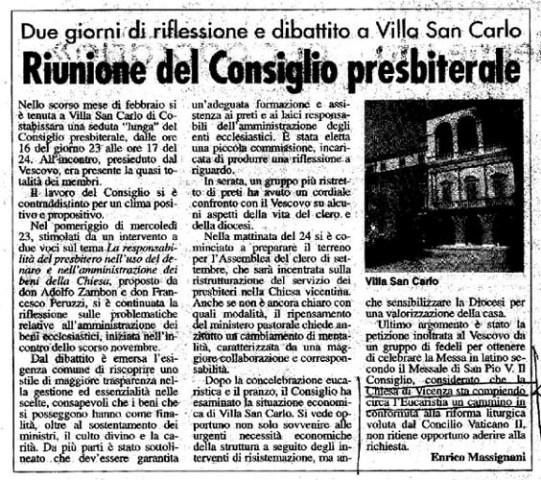 È stato osservato come al confronto di questo pezzo con la lettera del Vescovo di Vicenza del 1° marzo 2005 si rileva una difformità di informazione. Infatti nella lettera il Vescovo dice di aver assunto la decisione dopo aver sentito il Consiglio, mentre nel giornale diocesano si afferma che il Consiglio stesso abbia deciso ("non ritiene opportuno aderire alla richiesta"). Anche le motivazioni indicate sono parzialmente difformi. Mons. Nosiglia scrive di "aver consultato gli Organismi diocesani competenti, primo fra tutti il Consiglio presbiterale". Ora il Consiglio sarà competente a consigliare il Vescovo, ma non a prendere la decisione sul permesso per la messa antica, che spetta al Vescovo soltanto e della quale egli si assume per intero la responsabilità.