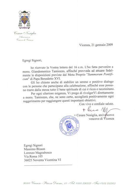 ho ricevuto la Vostra lettera del 16 c.m. L'ho fatta pervenire a mons. Giandomenico Tamiozzo, affinché provveda ad attuare fedelmente le disposizioni previste dal Motu Proprio "Summorum Pontifìcum" di Papa Benedetto XVI.