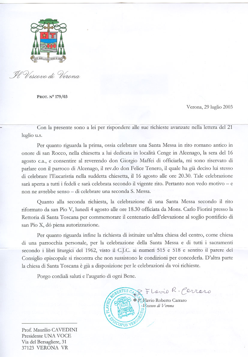 Lettera di Una Voce-Verona al Vescovo di Verona, 21 luglio 2003Il documento: